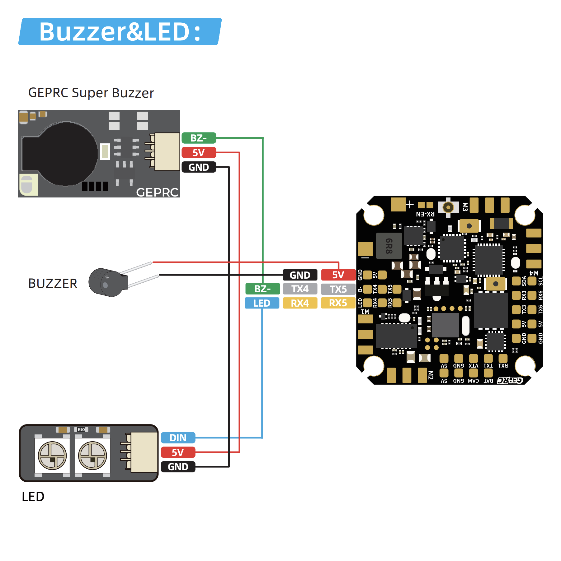 The TAKER F405 has dedicated buzzer pads clearly marked on the board. The buzzer connects directly to these, no hunting for spare pads or creative wiring needed. Polarity matters, so make sure positive goes to positive.
